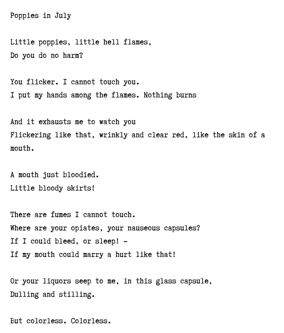 In these brief dozen or so lines, she asked the poppies for two contradictory things: blood ("If I could bleed") and opiates ("where are your opiates"). The blood represents her longing to feel alive, her hunger for sensation; the opiates signals total numbness, the desire to be dulled and stilled. Faced with an unbearable life, she wants both to feel the pain and to feel nothing at all. That moment of vulnerability is fierce and visible.