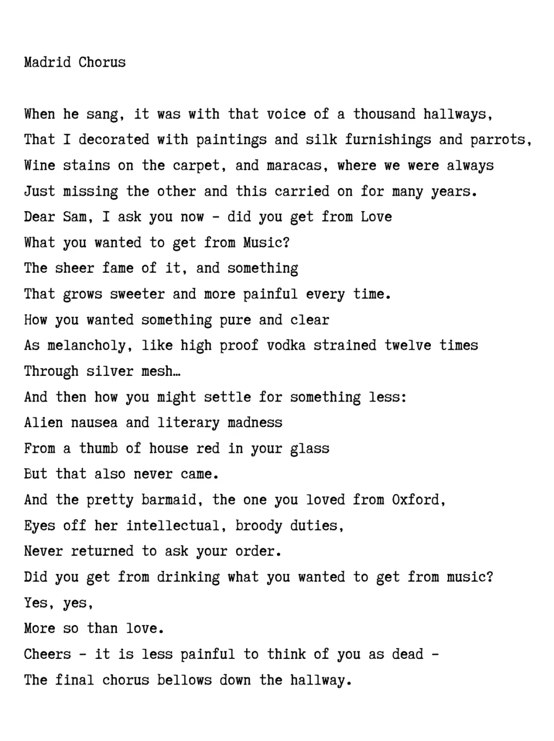 The above is Sarah Fletcher's poem Madrid Chorus, published in The London Magazine. The poem constructs its narrative through a subtle use of bathos: beneath a melancholic, blue-tinged emotional atmosphere, the speaker drinks like Baudelaire, searching for a crevice between beauty and pain in which to take shelter, while the "something pure and clear" they longs for never arrives.