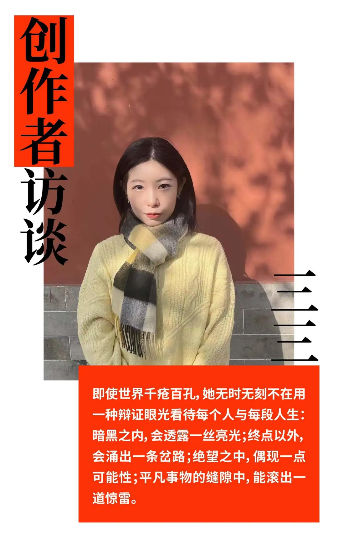 三三:之前的采访中我经常被问到这个问题,每次都尽可能给出一个不同的回答,因为同一个答案说好几遍挺无聊的。每个答案都只是一部分原因,比如“三三”是个坤卦;与真实姓名“姗姗”相对,平翘舌音都可以读等等。不过最直接的原因是,当时上海作协有个百校行项目,每年暑假会组织一些高中、高校学生去青浦写作营。一旦有作品发表,编辑会给作者取一个笔名,就像小时候英语课堂里老师会给你发英语名字一样。老师说,就叫三三吧,三三很好听。