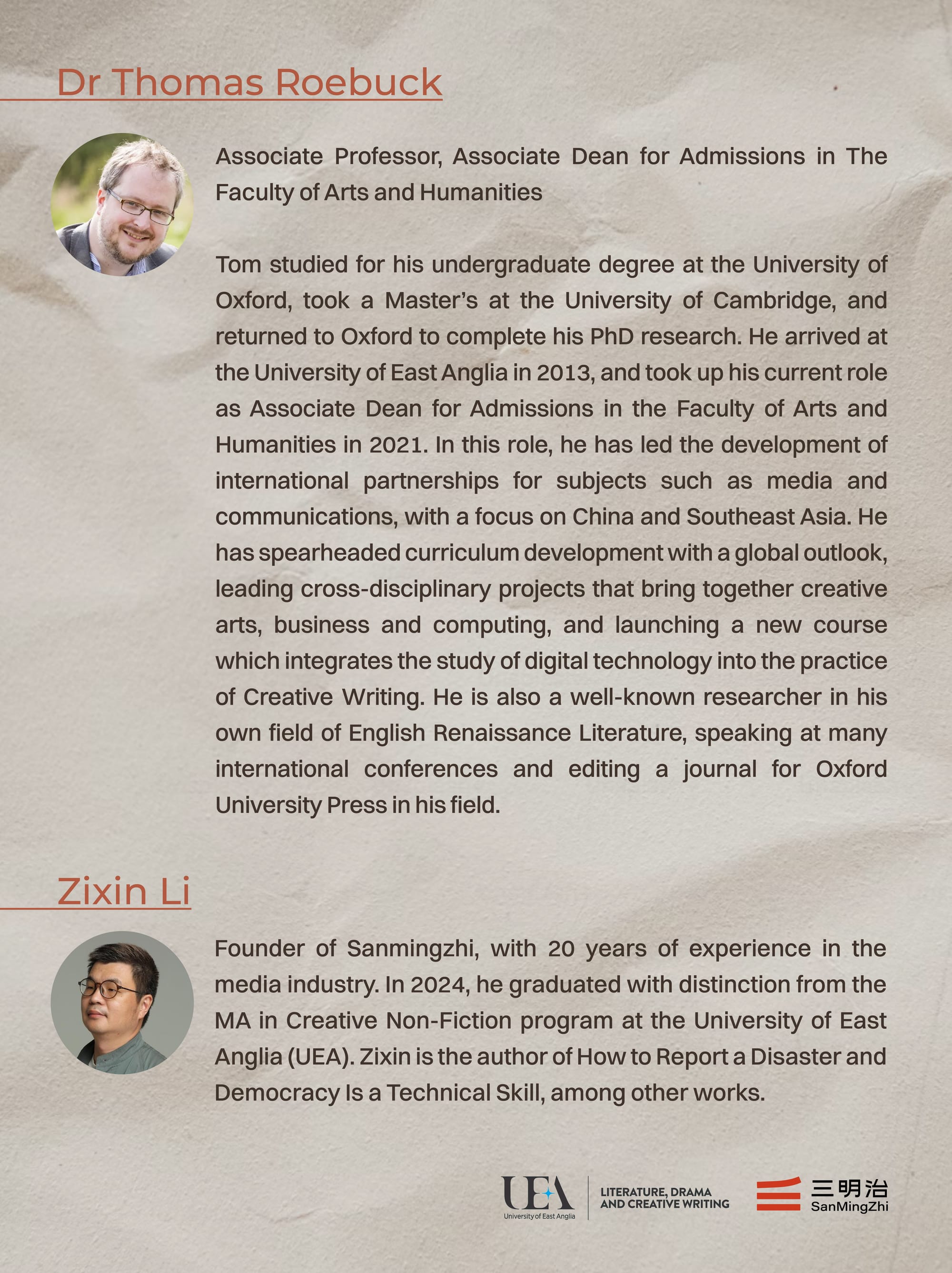 Zixin Li, founder of Sandwich and an alumnus of UEA’s Creative Writing program, will also be present. Together with Dr. Roebuck, he will discuss the differences and resonances between creative writing in China and the UK, and share his firsthand experiences in cultural content innovation and narrative practice.